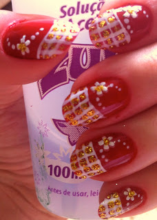 (3) Agora é da sua escolha! Você pode como eu colar aqueles adesivos que vendem de flores em qualquer loja de cosméticos ou fazer florzinhas utilizando carimbinho, palito ou até mesmo o pincel (na revista eles falam pra usar o pincel, mas eu quis inovar):