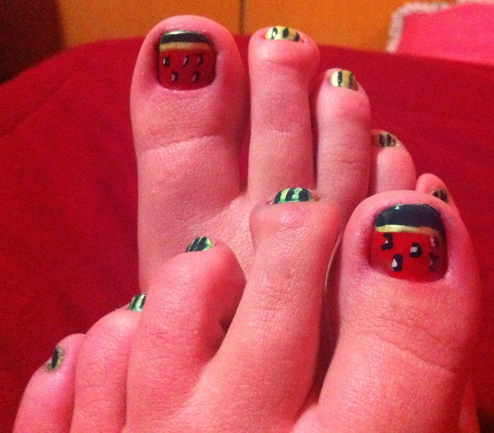 Prometo que faço essa unha na mão com mais carinho, mas invertendo: no dedão a casca e nos outros a melancia por dentro!!! =]