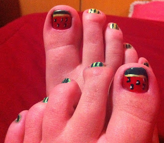 Prometo que faço essa unha na mão com mais carinho, mas invertendo: no dedão a casca e nos outros a melancia por dentro!!! =]
