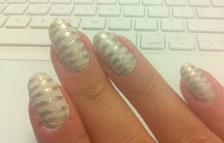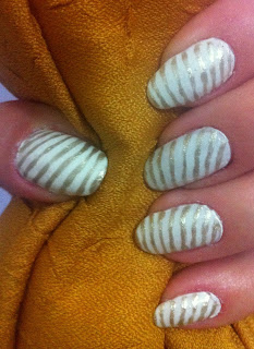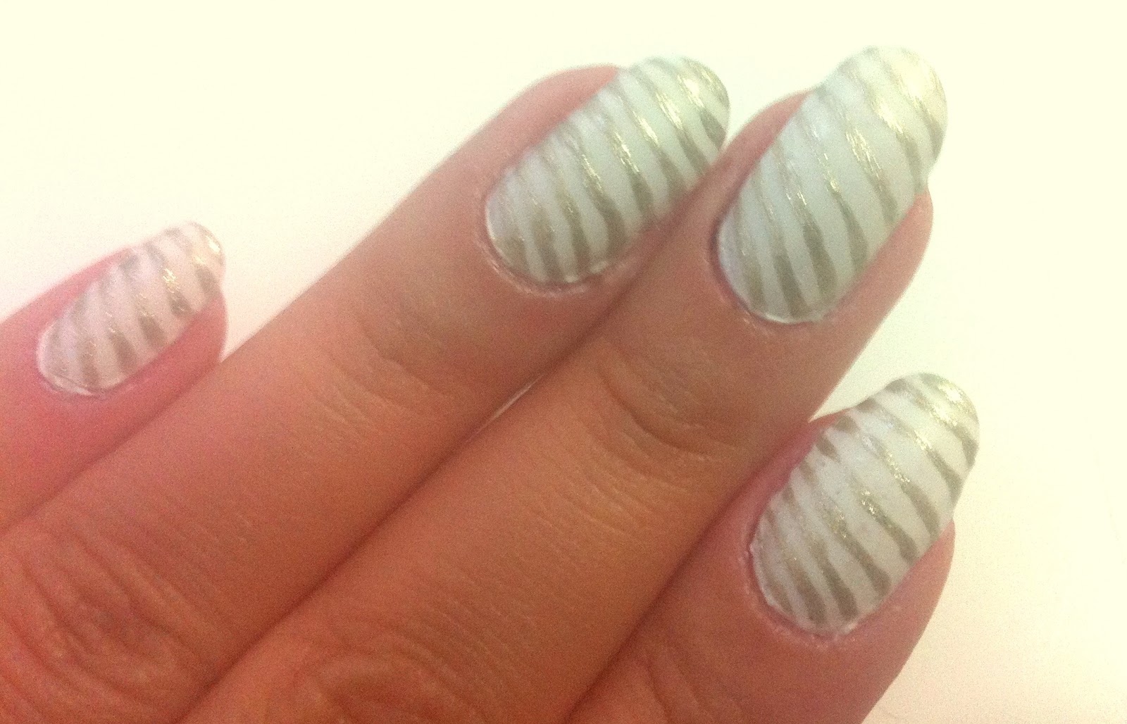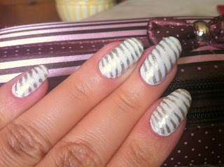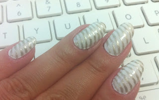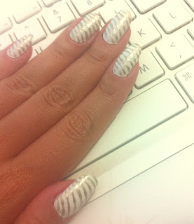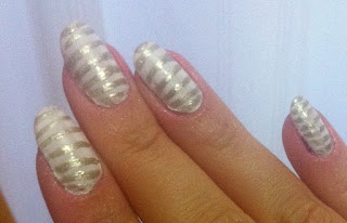 Ela é bem simples de fazer. Eu só pintei com esmalte branco e depois fiz listras com um pincel núm. 01 com esmalte prata! Eu achei que ficou bem delicadinho! =]