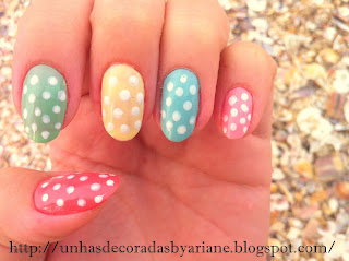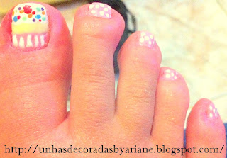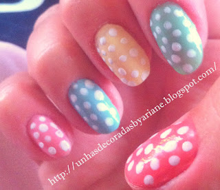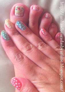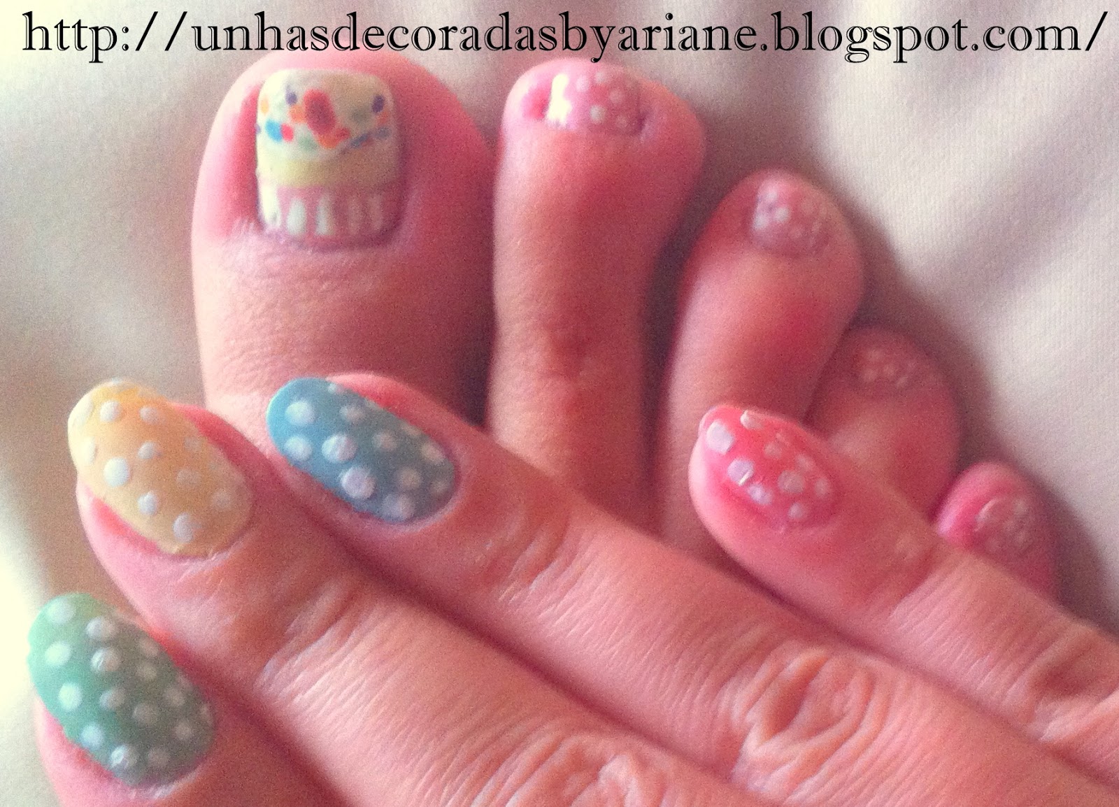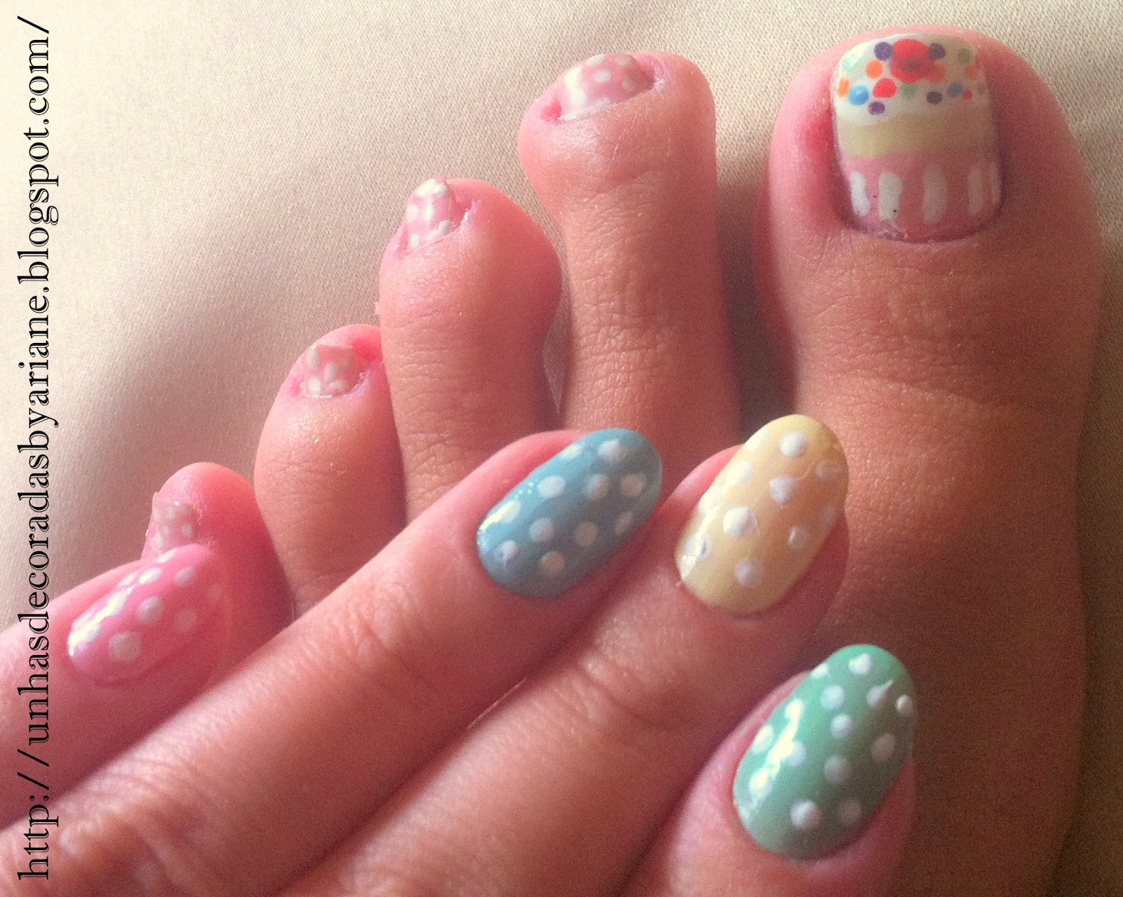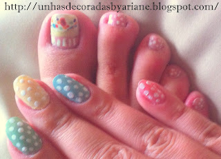 Aí eu resolvi fazer algo simples nelas só para deixa-las mais fortes e combinar com a unha do pé que está com cupcake (bolinhas em tons pastel):
