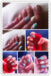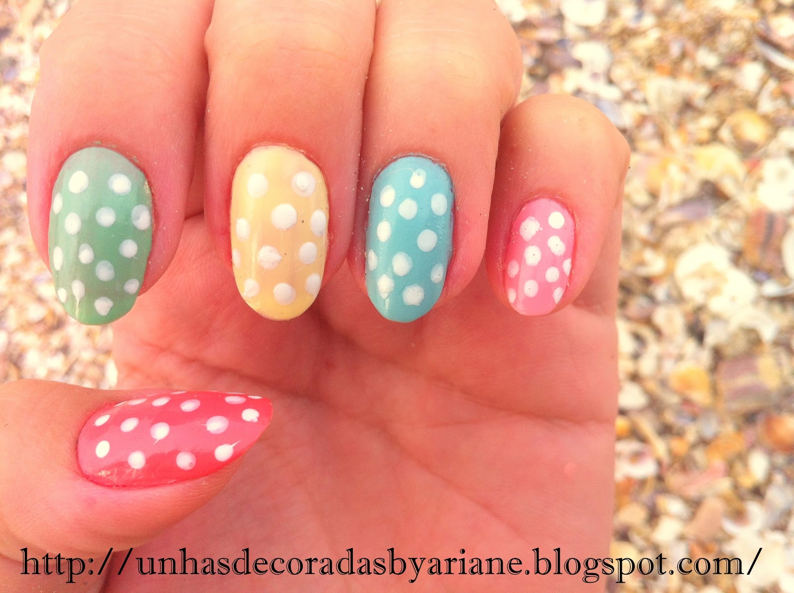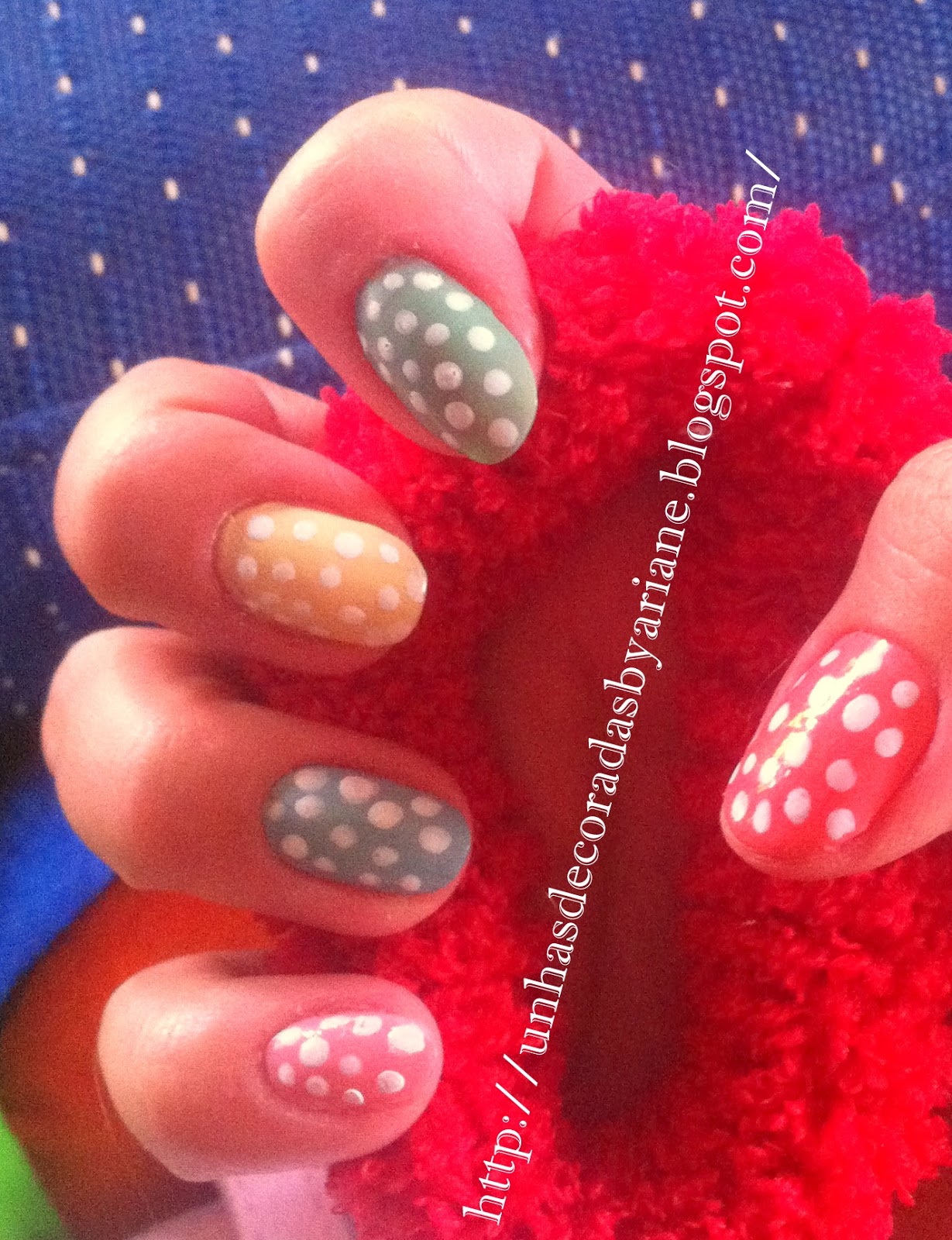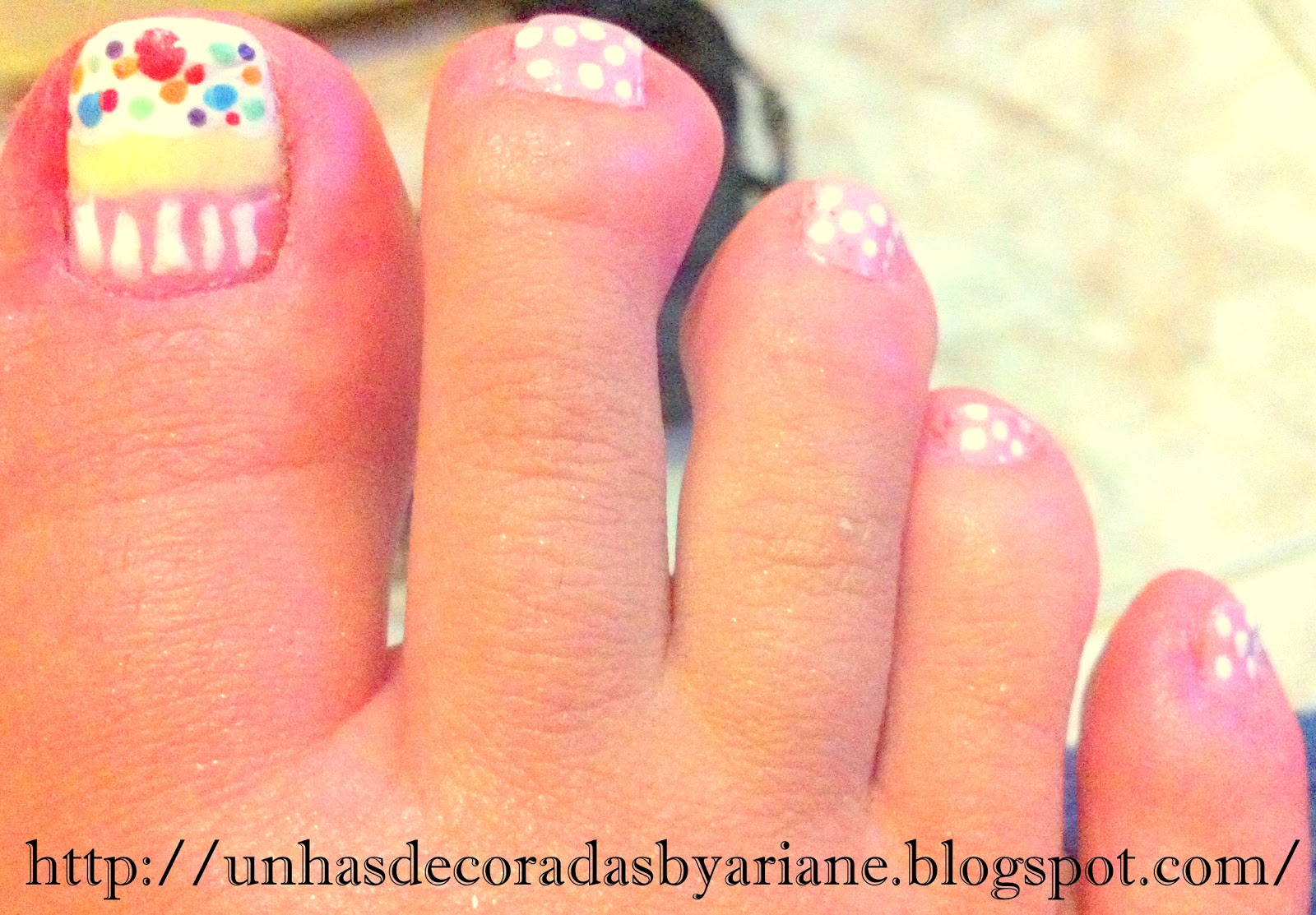 Aí eu resolvi fazer algo simples nelas só para deixa-las mais fortes e combinar com a unha do pé que está com cupcake (bolinhas em tons pastel):