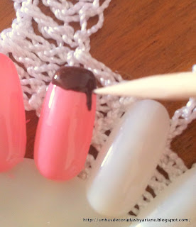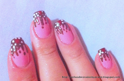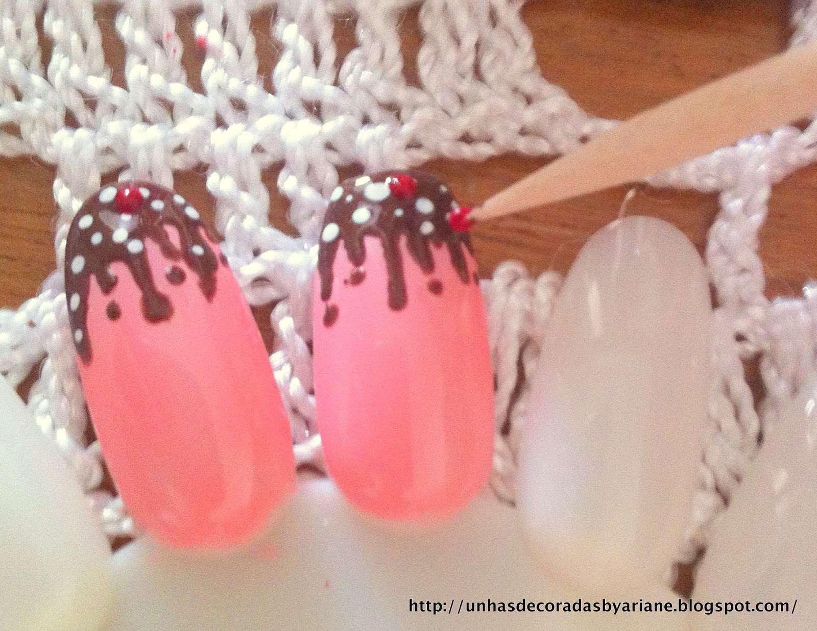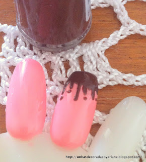 Com o palito "escorra" o esmalte marrom fazendo o efeito do chocolate escorrendo. Dá pra ver melhor nas fotos o que eu quero dizer: